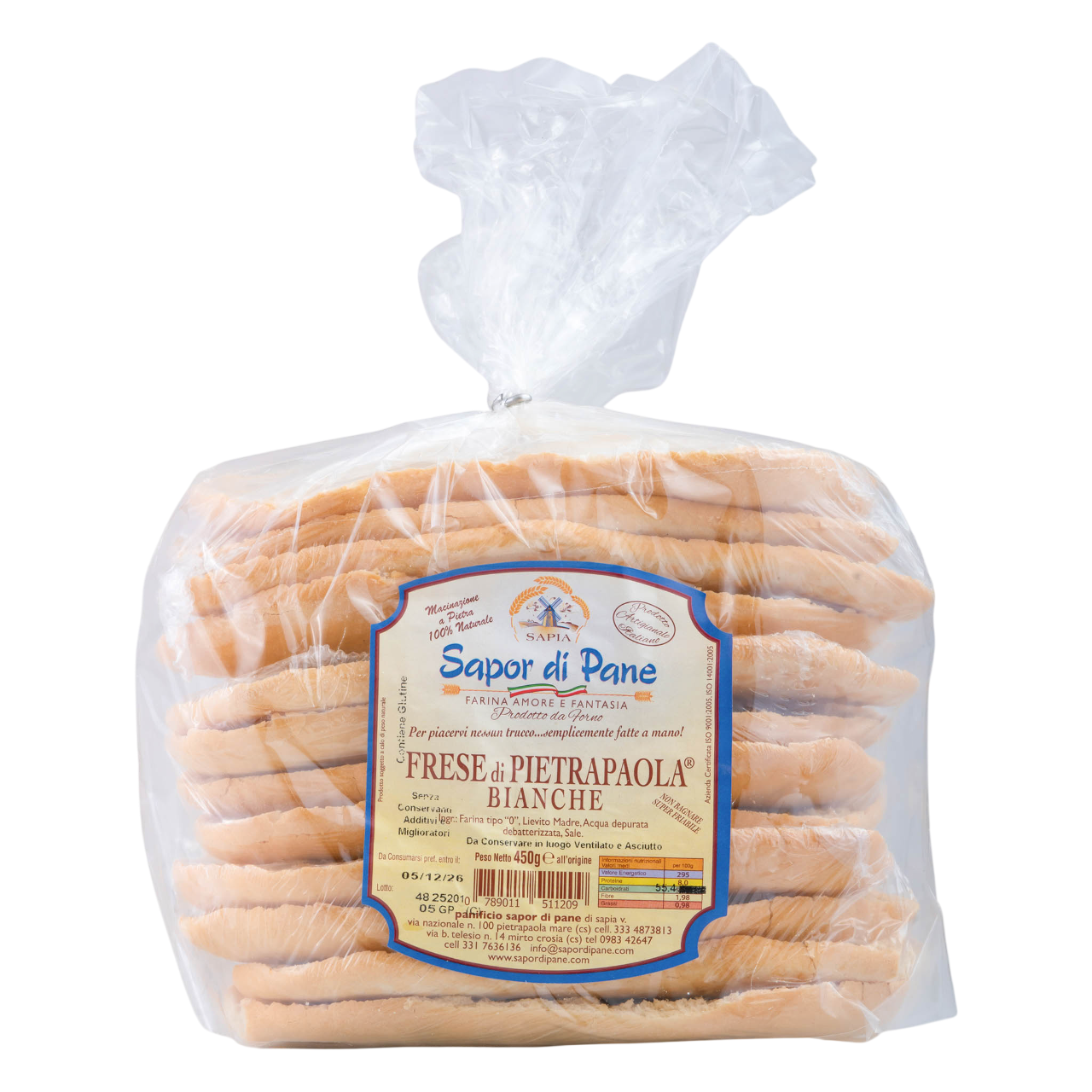 Frese di Pietrapaola bianche preparate con farina tipo โ€œ0โ€, lievito madre, acqua depurata debatterizzata e sale. Super friabili e pronte da gustare anche senza bagnarle. Vendute in cartone da 6 pezzi.