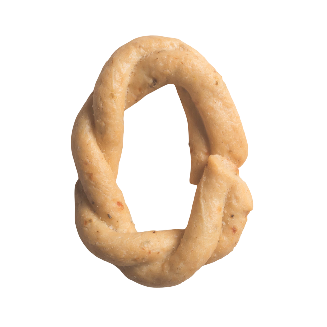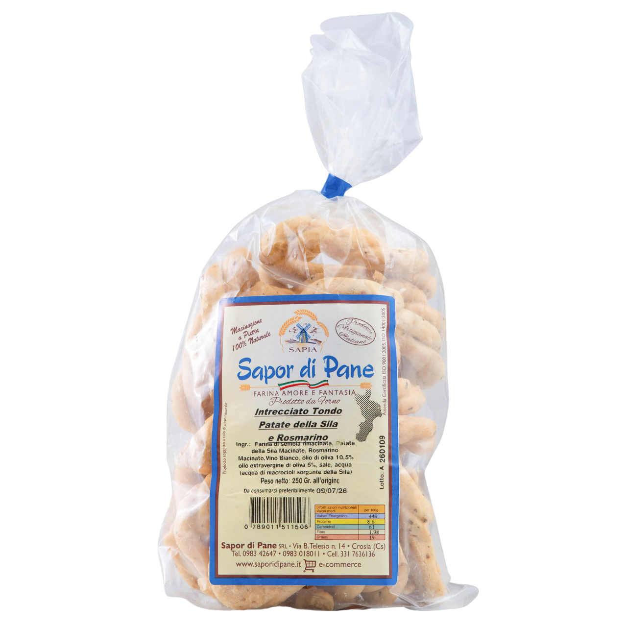 Intrecciato tondo alle patate della Sila e rosmarino, preparato con farina di semola rimacinata, patate della Sila macinate, rosmarino e oli di oliva. Croccante e aromatico. Venduto in cartone da 20 pezzi.