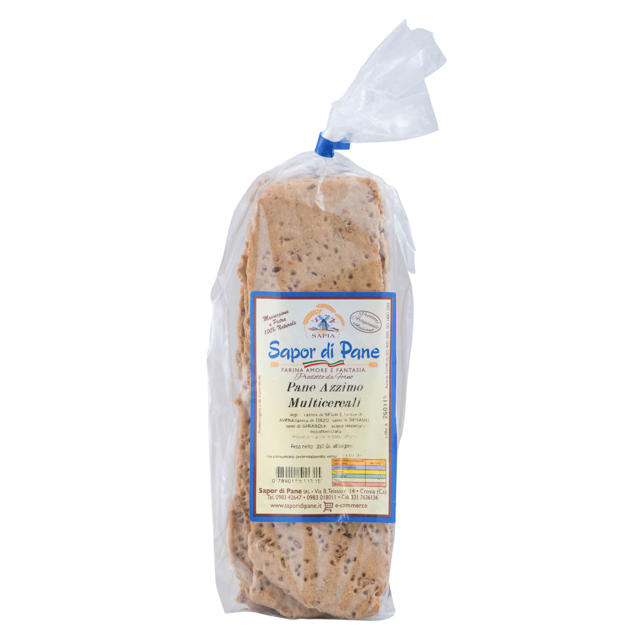Pane azzimo multicereali 350g senza lievito, con segale, avena, orzo e semi. Croccante e genuino. Disponibile in confezione da 15 pezzi.